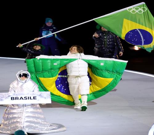 结果当领头的滑雪运动员Lucas张开双臂,翻开白色羽绒服反面的巴西国旗时,全场直接炸了。