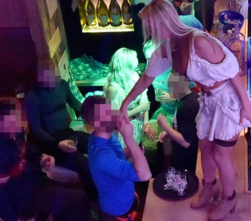 傍晚雪场的人陆续回小镇,霓虹灯一亮,酒吧音乐震得人耳朵发颤。有家昏暗酒吧里,一个中年英国男刷信用卡点了两大瓶香槟,递一瓶给旁边妆容精致的姑娘,姑娘凑上去亲昵回应;另一边,两个姑娘在起哄声中亲吻,换更多酒水——酒钱全是周围男的付。