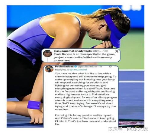 知名网球评论员也指出:“巴多萨的退赛史确实刺眼,但看过她比赛的人都知道,她从不会放弃任何一分。她的问题在于身体,而非意志。”