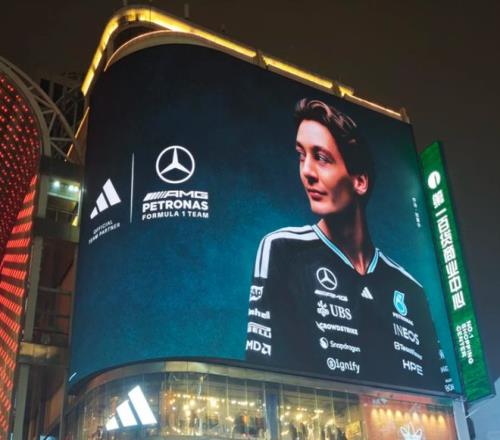 各个核心商圈铺满了f1车手的广告:奔驰车手拉塞尔的脸占据了南京东路阿迪达斯楼上的大屏,另一边的大屏则被勒克莱尔的粉丝包下来做成了应援广告;“汽车人”维斯塔潘代言的喜力啤酒海报用莫名其妙的广告词吸引着路过的人;汽车模型品牌比美高在商场快闪店门口立起了一溜车手人形立牌。
