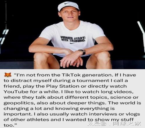 近日,世界第一辛纳接受了西班牙《世界报》的采访。在被问到为何在YouTube(油管)上更新视频时,辛纳表示,“我不是玩TikTok(短视频)那一代人。如果比赛期间要分散一下注意力,我会打电话给朋友,玩 PlayStation(电游),或者在YouTube(油管)上看视频。我喜欢看讨论各种话题的长视频,科学或地缘政治,还有更深层次的东西。世界变化得很快,了解一切都很重要。我还经常看其他运动员的访谈,我也想展示一些自己的东西。”有球迷调侃,“辛纳这是玩长不玩短呀!”“他真的挺自律,喜欢思考才能进步,怪不得人家是优等生!”